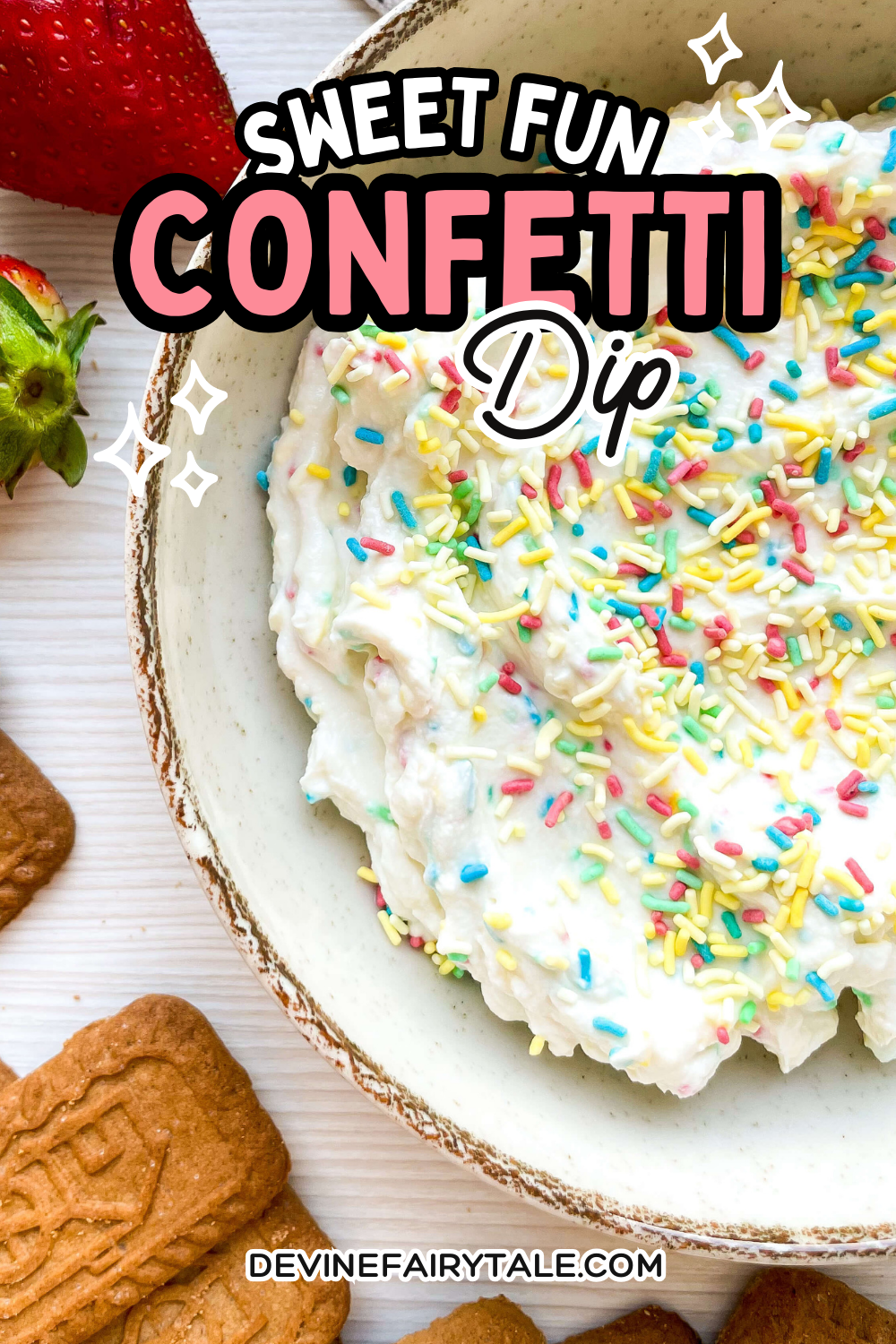 Want to make this fun fetti dip even more exciting? Create a dessert board around it. Use a wooden serving board or a large platter and fill it with all kinds of dippers. Add some fresh berries, mini cookies, and festive napkins for a sweet centerpiece that everyone will love.